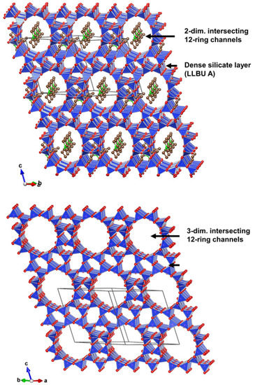 The LLBU-A of COE-11 is very similar to the layer-like building unit of zeolite beta (Figure 11, bottom) with the significant difference that the 12-ring pore of the beta LLBU is closed in COE-11. The LLBUs are stacked along the c axis in a sequence—LLBU-A => LLBU-B => LLBU-A … (see Figure 12). The intercalation of the rod-like LLBU-B units between LLBU-A units creates a two-dimensional pore system of intersecting 12-ring channels.