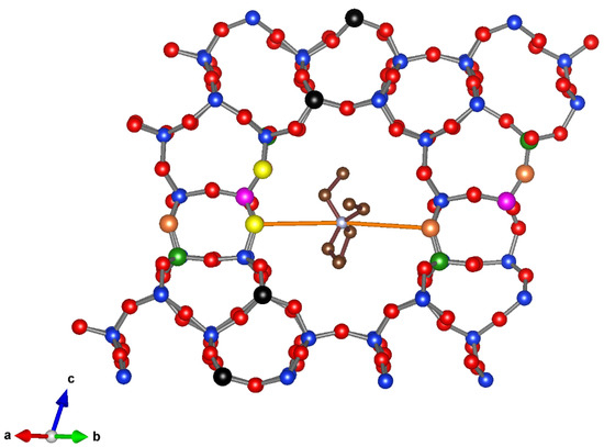 Three T sites of the COE-11 framework seem partly occupied by boron: T14 (green), T16 (black) and T19 (purple). Other Si atoms are displayed as blue spheres. The shortest N…O distances (orange lines) exist between nitrogen and O8 (orange) and O10 (yellow). Other O atoms are displayed as red spheres.
