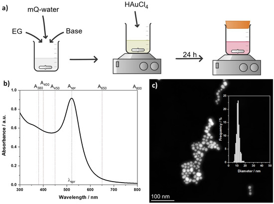 (a) Schematic of the reaction, (b) example of UV-vis spectrum and relevant features, and (c) examples of STEM micrographs with size distribution for Au NPs in the inset, obtained using 40 v.% EG and a LiOH/Au molar ratio of 4. The concentration of HAuCl4 was 0.5 mM.