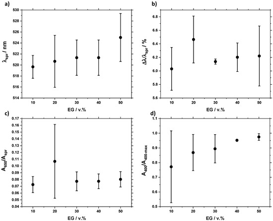 (a) λspr, (b) Δλ/λspr, (c) A650/Aspr and (d) A400/A400-max values and standard deviations for three different experiments, for samples prepared for different v.% of EG as indicated and a LiOH/HAuCl4 ratio of 4. The concentration of HAuCl4 was 0.5 mM.
