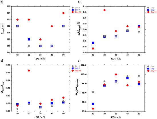 (a) λspr, (b) Δλ/λspr, (c) A650/Aspr and (d) A400/A400-max values for samples prepared for different v.% of EG as indicated and an LiOH/HAuCl4 ratio of 4. The concentration of HAuCl4 was 0.5 mM. The UV-vis characterization was performed 1, 7, or 14 days after synthesis, as indicated.