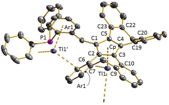 There are numerous examples in the literature describing the coordination of thallium(I) to aromatic compounds [,,,,,,], while only a few structurally characterized systems with thallium(I)–phosphorus coordination have been published. In 1974, Nakayama et al. published a gas-phase study on a series of thallium(I) complexes and stated that “No thallium(I) complexes with bismuth, arsenic nor phosphorus ligands has been isolated from a liquid phase so far.” []. This changed during the past two decades, in particular due to the use of weakly coordinating anions [,]. The fact that thallium(I) phosphine complexes are hardly accessible as long as there is an alternative for the metal cation is confirmed by the solid-state structure of compound 5. Compound 5 forms chains with thallium(I) centres bridging two (CpC)−1 moieties, as shown in Figure 3, and there is no interaction with the phosphine site. In addition to the coordination to the Cp site, thallium(I) also coordinates to two of the six-membered rings, the phenylene ring bound to the phosphorus atom and one of the phenylene rings of the CpC moiety. Since the covalency of the bonds between the thallium(I) and the π-donating moieties is low, the Tl-C bond lengths differ largely as documented in the caption of Figure 3 exemplarily for the Cp unit. This allows the adoption of the positioning of the cation to the steric requirements of the solid-state structure. According to the electrostatic interaction between the Cp site and the thallium(I) cation, the Cp-Tl distance (2.6131(4) Å) is much shorter than the Ar-Tl distances (3.3139(4) and 3.2030(4) Å).