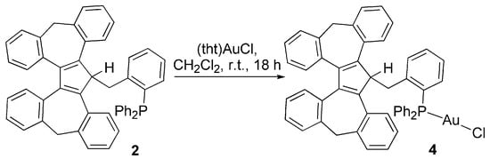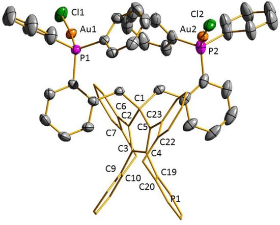 While for typical 31P NMR resonances of triarylposphine gold(I) chloride, complexes chemical shift of around 32 ppm are reported [,], the 31P NMR resonance of compound 4 appears at 24.4 ppm. We assign this to some shielding effects of the aromatic environment of the CpC backbone. The coordination of the gold(I) site in addition leads to a better separation of the aliphatic 1H NMR resonances compared to the metal-free ligand 2 (see the Supplementary Materials). Here, a triplet at 4.65 ppm (3JHH = 4.6 Hz) is assigned to the proton located at the five-membered Cp ring.