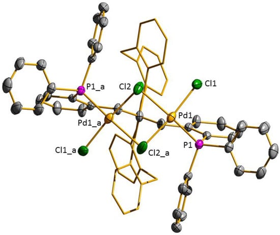 Molecular structure of compound 8 in the solid state. All hydrogen atoms are omitted for clarity. The central CpC system is represented in stick-style for clarity, ellipsoids are drawn at the 50% level. Characteristic bond lengths [Å], angles [°] and dihedral angles [°]: Pd···Pd 3.3098(6), Pd1-Cl1 2.2880(16), Pd1-Cl2 2.3144(16), Pd1-P1 2.2499(14), C1-C2 1.533(6), C2-C3 1.360(7), C3-C4 1.475(7), Cl1-Pd1-Cl2 173.99(6), Cl1-Pd1-P1 89.96(5), Cl1-Pd1-Cl2_a 90.27(5), Cl2-Pd1-P1 95.71(5), Cl2-Pd1-Cl2_a 83.83(6), Cl2_a-Pd1-P1 171.23(5), C3-C2-C8-C9 35.5(5), C2-C3-C4-C13 47.1(6).