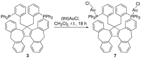 As mentioned above, the diphosphine functionalized CpC derivative 3 can only act as a typical diphosphine donor. However, the two phosphine sites are linked by a chain of overall seven carbon atoms allowing either a chelating coordination of the diphosphine to one metal site or a bridging coordination to two metal sites. The simplest way of dealing with these alternatives is by coordination of two equivalents of gold(I) to compound 3. The according gold(I) complex 7 was thus obtained in 83% yield in an analogous way as compound 4 using [(tht)AuCl] as the gold source (Scheme 6).