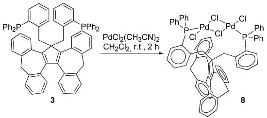 1H and 13C NMR spectra of complex 8 clearly prove the presence of a C2 symmetric compound. There are, e.g., only two doublets of doublets for the diastereotopic protons of the overall four methylene groups. While the methylene groups bridging the phenylene rings in the “wings” of the ligand give rise to two doublets at 3.82 und 3.89 ppm with a typical 2JHH coupling constant of about 12.4 Hz, the two methylene units linking the phosphine sites to the CpC core are observed at 4.80 and at about 7.78 ppm. The value of the latter chemical shift is rather unexpected. It was identified by means of a H,H-COSY NMR experiment and is explained by the fact that of two of these methylene proton direct towards the central Pd2Cl4 unit. According to the C2 symmetry of compound 8, there is only one resonance in the 31P NMR spectrum, observed at 25.4 ppm, which is a typical value for this type of palladium(II) compounds [].