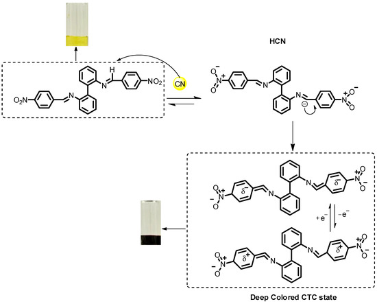 (Aza) Schiff’s bases [22,23] provide different mechanisms for the cyanide detection. In the most common scenario, the deprotonation of (aza) Schiff’s base molecules [24,25,26] takes place to cause a dramatic color change. The mechanism involved hydrogen bonding formation followed by hydrogen abstraction by CN−. To ensure efficient hydrogen abstraction in most cases the strong hydrogen bond donors, such as hydroxy- or NH-moieties, as well as strong acceptors, such nitro-group(s) need to be introduced into the structure of Schiff’s bases [27,28,29,30,31]. In most cases, the above-mentioned Schiff’s bases could be prepared via multi-step synthesis by using organic solvents and column chromatography. In addition, the most probes exhibited an almost identical colorimetric response towards both CN− and F− ions.
