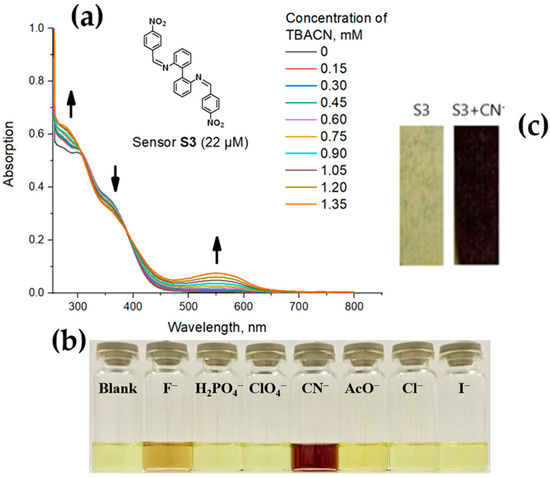 (a) UV-titration of S3 (22 μM) with TBACN (0–1.35 mM) in DMSO; (b) The selective response of S3 (1 × 10−3 M) to CN−3 vs. other anions (1 × 10−3 M); (c) S3-impregnated test stripe before (left) and after (right) the treatment with CN−3 ion-containing solution.