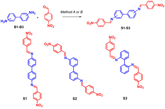 It should be noted that the synthesis of N4,N4′-bis(4-nitrobenzylidene)biphenyl-4,4′-diamine S1 was reported previously [40,41], however, with much prolonged reaction time (48 h) or in absolute ethanol with comparable reaction yields.