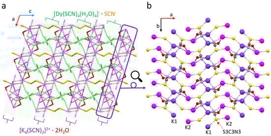 Structural motifs identified in 3D frameworks are reported here. (a). Crystal structure view along the b-axis. Particular components of the crystal structure are color coded for better clarity: [Dy(SCN)4(H2O)4]- green; S4, C4, N4 orange; O3 red; K1, K2, S3, C3, N3 violet. Single [K4(SCN)2]2+ layer viewed along the c-axis (b). Purple atom: K1, magenta K2, yellow: S3, grey: C3, blue: N3, red: O3. For clarity, [Dy(SCN)4(H2O)4]- complexes, thiocyanate 4 (atoms S4, C4, N4) and H atoms were omitted.