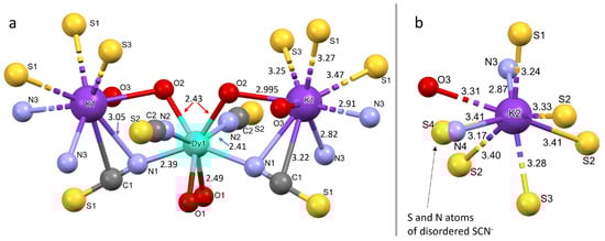 As shown in Figure 2a, for the Ln coordination geometry, the distance between Dy and coordinating N atoms is 2.39 and 2.41 Å, and the Dy-O distance is 2.49 and 2.43 Å. K1 cation interacts with the S and N atoms of the thiocyanate ligands, with the K1-S distance falling in the range of 3.25 to 3.47 Å and the shortest K-N distance of 2.82 Å (Figure 2a). The K1-O3 distance is 3.08 Å, while K2-O3 is 3.31 Å (Figure 2a,b). The shortest distances between Dy centers in the framework are 10.7 and 11.1 Å, along the a and c axis, respectively. The shortest distances between K1 centers is 4.82 Å and 4.03 Å along the a and c axis, respectively. The shortest distance between K2 atoms is 4.82 Å, while it is 4.52 Å between K1 and K2.