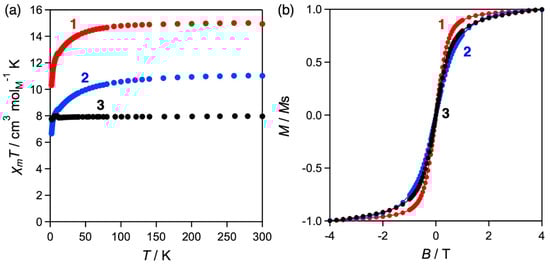 Direct current (DC) magnetic susceptibilities of polycrystalline samples 1, 2, and 3 were measured in the range of 1.8–300 K at the magnetic field of 0.1 T. As shown in Figure 3a, the χT values around room temperature are 15 cm3 K mol−1 (1), 11 cm3 K mol−1 (2), and 7.9 cm3 K mol−1 (3), which is consistent with those of the single ions of Dy3+ (6H15/2: J = 15/2 and gJ = 4/3), Tb3+ (7F6: J = 6 and gJ = 3/2), and Gd3+ (8S7/2: J = 7/2 and gJ = 2), respectively [3]. The decrease of the χT of 1 and 2 when lowering the temperature is considered to be due to the thermal depopulation of the sublevel excited states of Ln3+ ions [6], which mainly relates to zero-field splitting. Additionally, antiferromagnetic interactions between Ln3+ ions are considered to be relatively weak due to the efficient shielding effect of unpaired electrons in the Ln-4f orbitals, thereby making small contributions to the magnetization process. Please note that the small increase of χT around 10 K in 3 and 17 K in 2 and 3 is a measurement artifact due to “emu-range” change, not a property of the samples [31]. The magnetization-field loops show no visible hysteresis at 1.8 K in all compounds (Figure 3b).