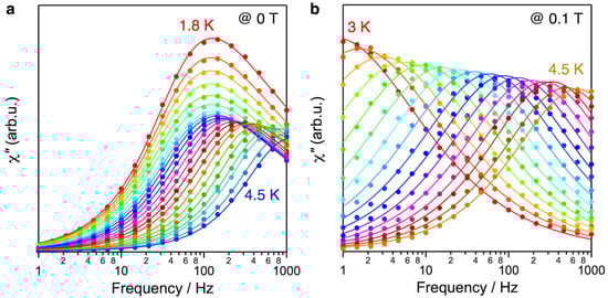 Alternating current magnetic susceptibilities of 1, 2, and 3 were measured for the study of their SIM behaviors. The Tb and Gd framework compounds 2 and 3 show slow magnetic relaxation but only under a magnetic field (Figure S1). At zero magnetic field, no slow magnetic relaxation phenomenon was observed for these two systems. Additionally, these two compounds show multiple Debye relaxations under a magnetic DC field, indicating the existence of second faster magnetic relaxation processes. Recently, in similar case, one of the two relaxation processes observed in the [Gd(phendo)4]3+ complex was shown to fade away upon dilution with diamagnetic Y3+ ions, suggesting that it was due to correlated spin movements arising from the dipole–dipole interactions between Gd3+ ions [32]. It was suggested that Gd3+ complexes might be good qubit candidates. Similar behavior of 3 is expected; however, we did not pursue that research pathway here. All in all, compounds 2 and 3 are not desirable SIM materials. On the other hand, for compound 1, shown in Figure 4 and Figure S2, clear peaks appeared in the frequency dependence of the out-of-phase (χ″) susceptibilities in the range of 1.8–4.5 K at zero fields (Figure 4a) and in the range of 3.0–4.5 K at the magnetic field of 0.1 T (Figure 4b). The peaks in the frequency dependence χ″ plot indicate the SIM behaviors of compound 1.