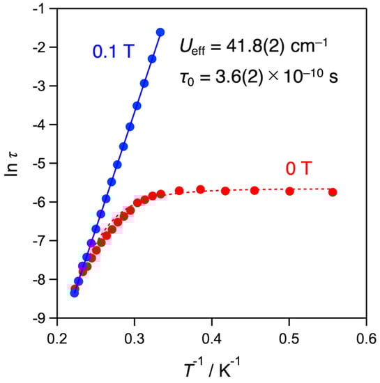 Figure 5 shows the Arrhenius plots of the relaxation times of compound 1. The Arrhenius plot (blue line) measured under an applied field of 0.1 T shows a straight line, indicating that compound 1 follows the magnetic relaxation of the Orbach process (Equation (4)):