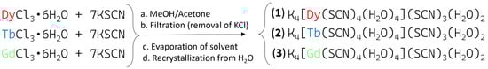 LnCl3·6H2O (Ln = Dy, Tb, Gd), potassium thiocyanate salts, and organic solvents were of analytical quality, commercially purchased, and used without any further purification.
