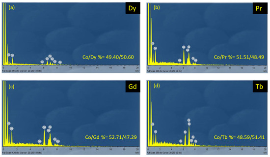 The EDX spectra of the samples of [CoIII2Ln2(NO3)4(pao)4(piv)4] (Ln = Dy, 1·2MeCN (a); Ln = Pr, 4 (b); Ln = Gd, 2 (c); Ln = Tb, 3 (d)).