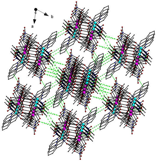 The 3D supramolecular network in the lattice structure of 1·2MeCN due to the intermolecular C-H…O interactions (dashed green lines).