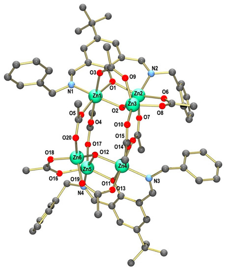 Ball and stick representation of the molecular structure of neutral complex 1 in crystals of [Zn6L2(OH)2(OAc)8]·3MeCN·0.5H2O (1·3MeCN·0.5H2O). Hydrogen atoms are omitted for clarity.