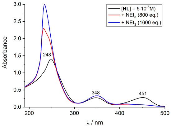 Measured UV-vis spectra of HL and its deprotonated form, L−. Experimental conditions: 5 × 10−5 M, CH2Cl2/MeOH (v:v/3:2), 298 K. The fully deprotonated ligand was obtained by adding an excess of NEt3 to the solution of HL.
