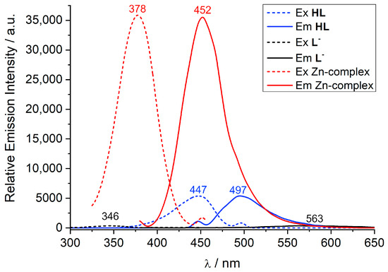 The complexation reactions were further examined using fluorescence spectroscopy. The emission spectra of compounds HL, L−, and of a 1:3 solution of HL and Zn(OAc)2 are displayed in Figure 6 along with the corresponding excitation spectra. The emission spectra were measured in acetonitrile solution at the 10−5 M concentration. Table 3 lists the data. The free ligand fluorescence is blue-green, reflected in a single emission band with a maximum at 497 nm when excited at 447 nm. The excitation spectrum of HL monitored at 497 nm corresponds to the absorption spectrum and reveals an absorption band at 447 nm that is assigned to a transition into the 1(π-π*) state of the bis(iminomethyl)phenol system. The deprotonation of the ligand has a strong effect on the luminescence properties. This can be detected by the naked eye. Thus, in contrast to HL, L− exhibits a very weak, intraligand 1(π-π)* fluorescence emission band at 563 nm. The luminescence intensity decreases by a factor of 15, and the Stokes shift increases from 2250 cm−1 for HL to 11,139 cm−1 in L−. Remarkably, the complexation of the ligand by Zn2+ leads to a circa six-fold enhancement of the luminescence intensity, which is also accompanied by a hypsochromic shift in the emission band to 452 nm. This behavior has been observed for other Zn2+ complexes supported by o-hydroxy-aryl Schiff base ligands [65,66,67,68]. The enhancement of the emission intensity can be explained by the CHEF effect (chelation-enhanced fluorescence effect) due to the inhibition of photo-induced electron transfer processes [69,70].