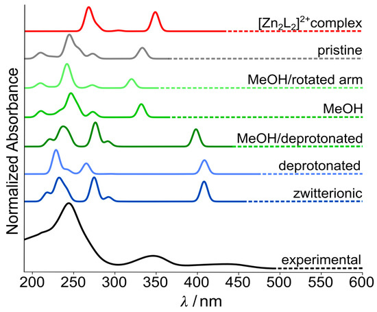 Simulated UV-vis spectra of different HL forms. Included are the zwitterionic form, explicitly coordinated methanol, deprotonated HL, the pristine ligand and the [Zn2L2]2+ complex. The spectra were obtained using AMS code [53].