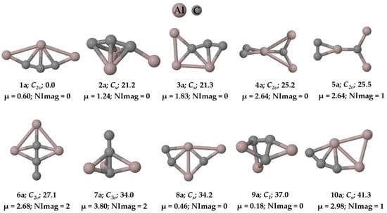 The PESs of the are explored, and we found that the global minimum energy geometry (1a and 1n) of both the anion and neutral system contains a carbon atom (C4) with two π bonds and three σ bonds, exhibiting a total of five bonds through tri-coordination. The ten low-lying isomers of the anion and the neutral system are given in Figure 1 and Figure 2, respectively. All other isomers on the PES of the system are given in the Supplementary Materials in Figures S1 and S2, respectively. The system has a singlet spin state and the system corresponds to a doublet. Isomer 1a is a planar structure with C2v symmetry, whereas isomer 1n shows C2 symmetry, in which the terminal aluminum atoms are out of the plane (see Figure 3). The system also has structures that exhibit planar penta-coordinate aluminum (ppAl) and planar tetra-coordinate carbon (ptC) atoms as local minimum energy isomers (8a, 7n; and 3a, 13a, and 8n, respectively) on their PESs. Nevertheless, our focus here is on the global minimum energy isomers, 1a and 1n, which exhibit five bonds to carbon through tri-coordination.