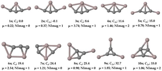 Ten low-lying isomers of with ZPVE-corrected relative energies (in kcal mol−1), dipole moments (in Debye), and the number of imaginary frequencies (NImag) obtained at the PBE0-D3/def2-TZVP level.