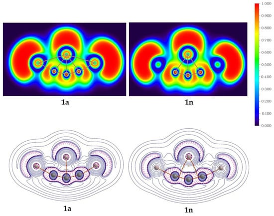 The color-filled map of ELF (top row) and the Laplacian of electron density (∆2ρ(r)) with bond paths (bottom row) for isomers 1a and 1n at the PBE0-D3/def2-TZVP level.