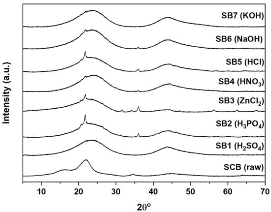 Figure 1 shows X-ray diffraction (XRD) patterns obtained from the raw SCB and the chemically activated SCBs after pyrolysis. The XRD pattern of raw SCB shows three broad halos at 16.34 (110), 22.05 (002), and 34.68° (004) 2θ. These signals can be assigned to the presence of cellulose I [,].