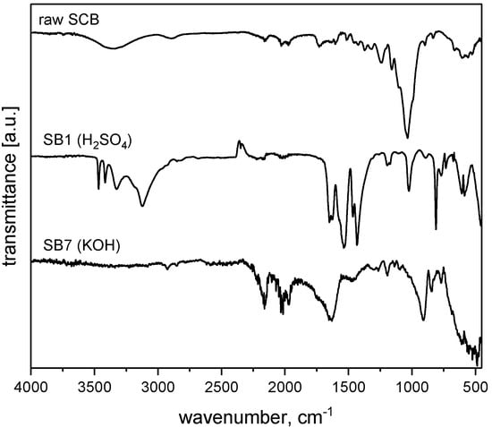 Figure 2 shows representative IR spectra obtained from raw SCB, SB1, and SB7. Spectra of raw SCB show a broad peak centered at 3614 cm−1, which can be assigned to the O-H stretching vibration of intramolecular hydrogen bonds in carbohydrates and lignin []. Bands centered at 3029 cm−1 stem from C-H bond vibrations []. A small band at 1770 cm−1 can be assigned to C=O bond vibrations of aldehydes, ketones, or carboxyl groups [,]. Furthermore, bands at 1612 and 1525 cm−1 are attributed to the aromatic rings present in lignin and to adsorbed water, while a band at 1281 cm−1 can be assigned to C-O stretching vibrations in lignin [,,].