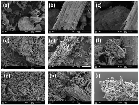 SEM images of SCB (a–c), SB1 (d–f), and SB7 (g–i) at different magnifications.