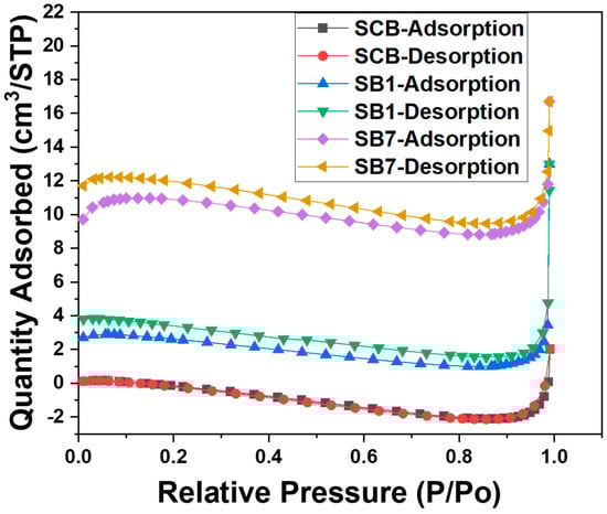 Figure 4 shows complementary nitrogen sorption data for the three materials, SCB, SB1, and SB7. All datasets are very similar and only show a very limited N2 uptake and a correspondingly small surface area of all materials. SCB is essentially non-porous (note that nitrogen sorption does not detect macropores, which are visible in the SEM images). The surface area determined for SB1 is 6–8 m2/g, and SB7 has a surface area of around 30 m2/g. Overall, these data indicate that the materials are essentially macroporous powders with negligible mesopore and micropore fractions.