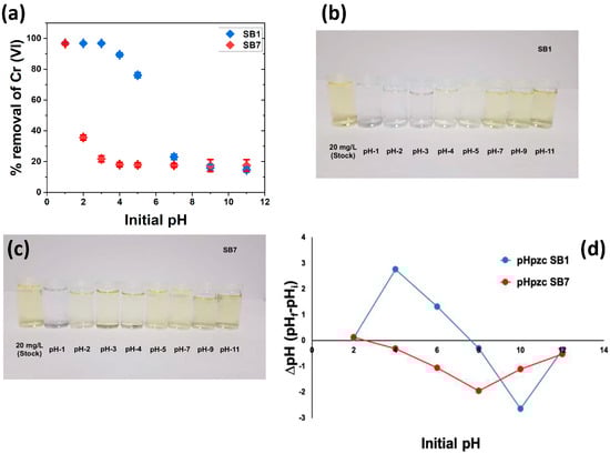 (a) Cr(VI) removal vs. initial pH for SB1 and SB7 (C0 = 20 mg/L, m = 0.1 g, V = 25 mL, t = 24 h, T = 30 °C, rpm = 200). (b) Solution color vs. pH for treatment with SB1. (c) Solution color vs. pH for treatment with SB7. (d) Determination of pHpzc for SB1 and SB7 (C0 = 0.01 M NaCl, m = 0.15 g, V = 50 mL, t = 48 h, T = 25 , rpm = 200).