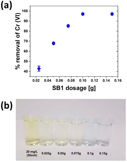 (a) SB1 dose vs. Cr(VI) removal (C0(Cr) = 20 mg/L, pH = 3, V = 25 mL, t = 24 h, T = 30 °C, rpm = 200). (b) Photograph of the solutions after treatment with increasing adsorbent dose.