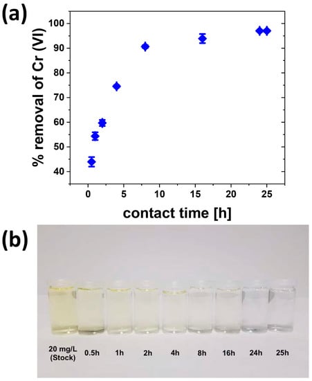 (a) Contact time vs. Cr(VI) removal (C0(Cr) = 20 mg/L, pH = 3, m = 0.1 g, V = 25 mL, t = 24 h, T = 30 °C, rpm = 200). (b) Photograph of solutions after treatment.