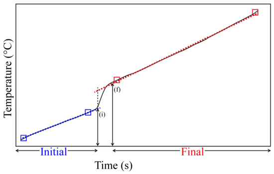 Example of an incremental addition of a base (e.g., pyridine) using the magnetic stirring system in the calorimeter, showing the initial and final interval time before a new addition. (i) time of the base injection; (f) time where the system reaches the maximum increment of temperature.