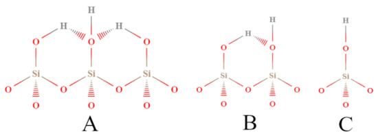 Types of silanol sites distinguished by the Cal-Ad method: (A) bridged; (B) vicinal; (C) isolated (terminal). Adapted from reference [89]. Copyright @ 1993 ACS.