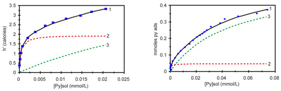 Experimental data curve (1) and fitted isotherms to process one (dashed red line) and process two (dashed green line) for two-site model of the calorimetric (left) and adsorption (right) experiments. Adapted from reference [90]. Copyright @ 1997 ACS.