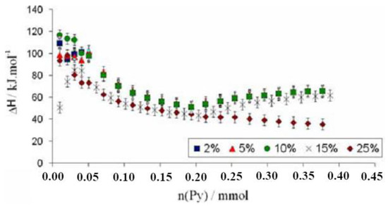 Most chemical reactions involving heterogeneous catalysis deal with the adsorption of a liquid or gas on the surface of the catalyst. The correlation of reactivity to acidity is essential since different acid site strengths are required according to acid-catalyzed reactions. In order to characterize the catalyst and its reaction mechanisms, solid surface microcalorimetry methods have been shown to be an important tool, since they can be coupled to other spectroscopic techniques. Among the solid acids for which the thermodynamic parameters were determined by the Cal-Ad method, zeolites play a prominent role due to their microporous crystalline structures. Then, Drago et al. [90] studied HZSM-5 (Si/Al = 36) acidity using three different bases (pyridine, 2,6-lutidine, and 2,6-di-tert-butylpyridine), and two types of sites were resolved indicating that both sites react simultaneously even at lower base concentration. The Cal-Ad isotherms for pyridine adsorption are shown in Figure 5. Pyridine was chosen as the donor to avoid the amphoteric interaction observed when protonic donors (e.g., NH3) are used, promoting an increased hydrogen bonding of the N-H proton to the framework. Comparison of the pyridine enthalpy interaction indicated a stronger Brønsted site (−ΔH1 = 176.1 kJ mol−1) than silica gel and γ-alumina, but not superacid as aluminum chloride supported on silica gel ((SG)nAlCl2) [94]. The thermodynamic data for the second site on HZSM-5 (−ΔH2 = 35.9 kJ mol−1) is comparable to that of the sites on silica gel. In relation to the other two bases, 2,6-di-tert-butylpyridine cannot enter the channels and provides information about the acidity of the external solid surface (i.e., −ΔH1 = 45.6 kJ mol−1) indicating the strongest sites are in the channels. Using 2,6-lutidine, the highest enthalpy (−ΔH1 = 79.5 kJ mol−1) suggests that there is an average between some strong sites with others that are weaker, but both are hydrogen bonding type sites. A detailed analysis of all data (−ΔH’s and n’s) indicated up to four site types: a strong, but limited access (I); limited access hydrogen bonding (II); interior hydrogen bonding (III); and surface (IV). The fair agreement between the 0.6 mmol g−1 sites found by Cal-Ad and the 0.5 mmol g−1 sites found in the gas phase of a similar HZSM-5 sample suggests that pyridine migrates from site to site during the few second time scale of the solution calorimetry (25 °C).