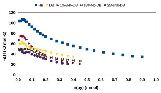Dias et al. [124] studied cesium salts of 12-tungstofosforic acid (HPW), i.e., with formulas CsxH3−xPW12O40 (abbreviated as CsxH3−xPW) because of their notorious and commented superacidity, shape selectivity, and hydrophobicity [125]. However, unlike HPW, CsxH3−xPW salts have very limited solubility in water or organic solvents and are used exclusively as heterogeneous catalysts. While cesium derivatives show greater thermal stability, some of them have greater catalytic activity in certain reactions than HPW [126,127,128]. Salts in the CsxH3−xPW12O40 series (x = 1; 2; 2.5; and 3) are prepared and characterized by structure and acidity using the Cal-Ad method. XRD, FT-IR, and 31P MAS NMR confirmed the formation of salts, whereas microcalorimetry is capable of distinguishing the strength and quantity of the different acid sites in the catalysts. The distribution of protons and cesium ions in the salt structures is almost homogeneous according to stoichiometry, confirmed by XRD and 31P MAS NMR. Furthermore, Cal-Ad enthalpy measurements indicate that no mechanical mixing of the salts is produced under these experimental conditions, confirming the description of these salts as solid solutions. The Cal-Ad results indicate the protons distributed in these solids have different strengths, leading to the following order of acidity: HPW > Cs2HPW ≥ Cs2.5H0.5PW > CsH2PW > Cs3PW, with enthalpies of −ΔH1 = 136.8; 117.9; 114.6; 87.0; and 32.6 kJ mol−1, respectively. These enthalpies are influenced by an endothermic term related to the interstitial expansion of the lattice by the addition of the pyridine molecule, which is evidenced by XRD results. The nature of the sites in these CsxH3−xPW12O40 series was Brønsted and hydrogen bonding, according to FT-IR of pyridine adsorption.