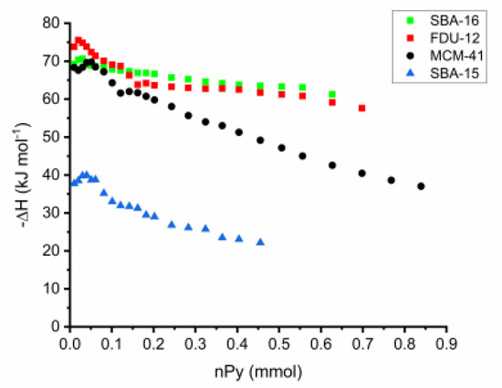 In another research report, Chronister et al. [89] studied silica gel under various hydration conditions by the Cal-Ad method using pyridine as a donor probe. Silica gel is an amorphous material derived from SiO2 having a highly porous form. This solid has great importance because it is used as a support in heterogeneous catalysis, as well as separations, microelectronic fabrication, and bioactive bioglass products [96,97,98]. In addition, silica has been widely studied by many spectroscopy methods (e.g., infrared spectroscopy, and nuclear magnetic resonance). The Cal-Ad method proved to be more sensitive than other characterization techniques for finding three hydrogen bonding sites of different strengths (Figure 4). In previous studies, it was considered that the silica surface was formed by only one type of hydrogen-bonding site [99,100]. Previous studies based on models of silsesquioxanes showed that sites of differing reactivity were expected to be present on the surface, which depended on the extension of hydrogen bonding between neighboring hydroxyls. Accordingly, isolated silanols are less acidic than clusters taking at least three commonly hydrogen-bonded hydroxyl groups [101]. Thus, the Cal-Ad method was able to obtain the enthalpy and equilibrium constant of binding, and the number of each of these sites (e.g., for silica evacuated at 28 °C: −ΔH1 = 52.7 kJ mol−1; n1 = 0.86 mmol g−1; −ΔH2 = 22.2 kJ mol−1; n2 = 0.86 mmol g−1).