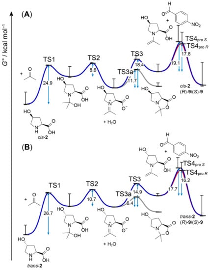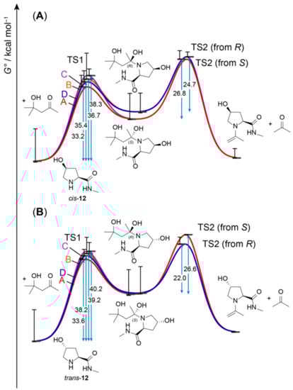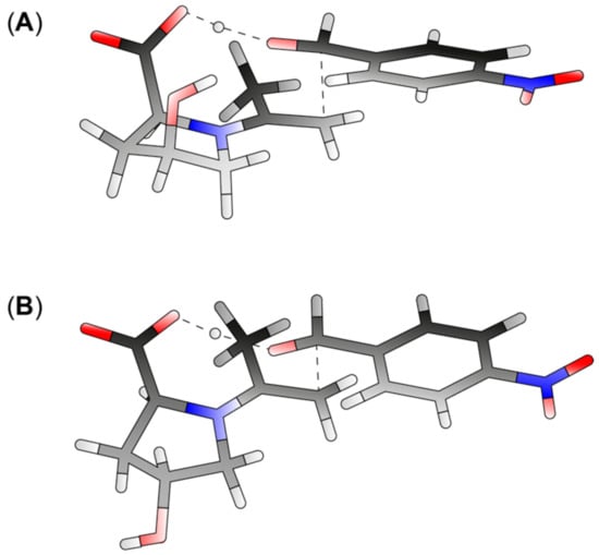 In cis-4-hydroxyproline (cis-4-Hyp, cis-2, Figure 1), Cγ-endo is the most preferred puckering that would also allow the formation of an intramolecular hydrogen bond between the cis-4-hydroxy group and the carboxylic acid group. Similarly, 1 has a slight preference for Cγ-endo. In contrast, in trans-4-hydroxyproline (trans-4-Hyp, trans-2, Figure 1), the 4-hydroxy group imposes a Cγ-exo pucker. This is in accordance with the gauche empirical rule, an effect that also contributes to the outstanding stability of the collagen triple helix [31,32]. Intuitively, the ring puckering should also affect the stereoselectivity of reactions catalyzed by hydroxyprolines and related peptides. Surprisingly, in different reactions tested, the stereochemical outcome of reactions (aldol, Mannich and Michael asymmetric reactions) catalyzed by cis-2 or trans-2 was similar to 1 catalysis or even lower [33]. These observations prompted us to study the reaction channels leading to either an R- or an S-configured product in Hyp-catalysis or catalysis by Hyp-derived dipeptides in further detail, in particular, with respect to the role of the conformer distribution in organocatalysts, transition states, and intermediates.