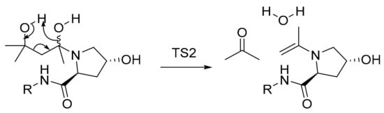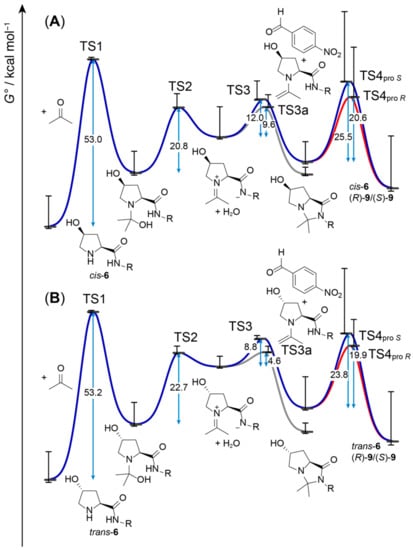 The highly similar stereochemical outcome of both conversions suggests only a little influence from the 4-hydroxy group on enantioselectivity confirming previous observations [33]. Theoretical models from previous studies on proline catalysis have shown that the stereoselectivity is determined by the relative arrangement of the double-bonded methylene group of the enamine intermediate (Scheme 1) and the carbonyl group of the substrate. Here, a coordination of the carbonyl oxygen by the carboxylic acid group of the enamine intermediate in TS4 clearly favors an R-configured product (TS4pro R) as the energy barrier via TS4pro R is lower than via a transition state TS4pro S with opposite arrangement.