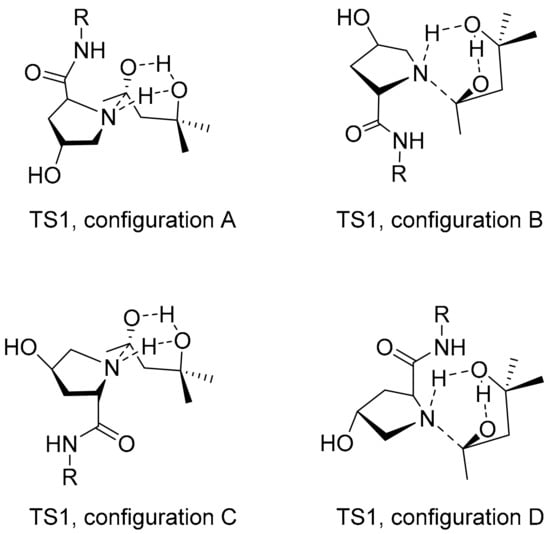 Assuming that with a peptide catalyst, a hemiaminal is not formed from catalyst and acetone, but from acetone and 10, proton transfer would be conveniently mediated by the β-hydroxy group of 10. Due to reduced symmetry of 10 in comparison to acetone, such a transition state could be modeled with four different configurations, of which two transition state configurations lead to an R-configured hemiaminal, and two to an S-configured hemiaminal (Figure 6). Each of the four configurations allow a comparably ‘relaxed’ transition geometry comprising a six-membered ring formed from the atoms that are involved in C,C-bond formation and proton transfer.