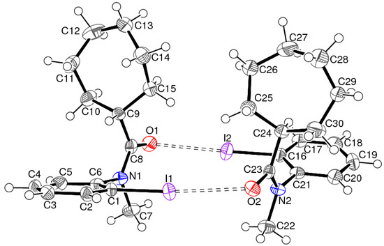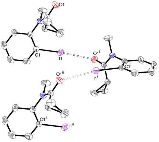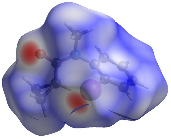 In order to further quantify the intermolecular interactions in these crystals, their Hirshfeld surfaces were generated using CrystalExplorer [15] following the methodology described by Tan et al. [16]. The Hirshfeld surface of 1 (Figure 6) shows intense red spots in the vicinity of atoms O1 and I1, which clearly correlate the halogen bond described above. Otherwise, the surface is blue, indicating contacts at the expected van der Waals’ distance or greater.