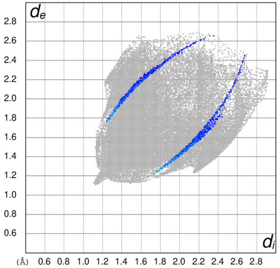Two-dimensional fingerprint plot of de versus di for 1, with the regions corresponding to the I⋅⋅⋅O contacts highlighted in blue.