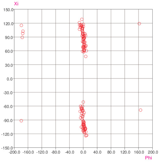 Scatterplot of the ξ (xi) and ϕ (phi) torsion angles (see the text).