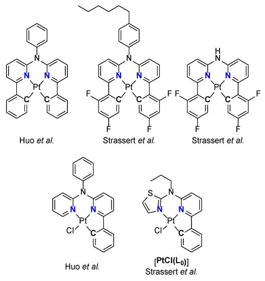 - Li, K.; Tong, G.S.M.; Wan, Q.; Cheng, G.; Tong, W.-Y.; Ang, W.-H.; Kwong, W.-L.; Che, C.-M. Highly Phosphorescent Platinum(II) Emitters: Photophysics, Materials and Biological Application. Chem. Sci. 2016, 7, 1653–1673. [Google Scholar] [CrossRef]