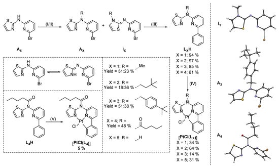 Left—Reaction schemes for the synthesis of the complexes with tridentate ligands. (I) Alkylation: bromoalkane, Cs2CO3, THF, reflux, 16 h, 18–51% yield. (II) Acylation: valeric anhydride, 170 °C, 3 h, 48%. (III) Suzuki–Miyaura cross-coupling: phenyl-boronic acid, K2CO3, [Pd(PPh3)4], THF, H2O, reflux, 16 h, 81–97% yield. (IV) Cyclometallation: K2[PtCl4], nBu4NCl, glacial acetic acid, reflux, 16 h, 14–64% yield. (V) Cyclometallation: K2[PtCl4], MeCN/H2O, reflux, 16 h, 5% yield. Right—Molecular structure in single crystals of I1 (top), A3 (center), and A4 (bottom). Displacement ellipsoids are shown at 50% probability.