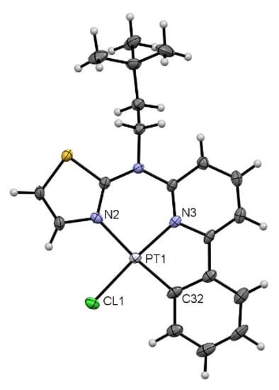 We were able to obtain the molecular structures of [PtCl(L2)] and [PtCl(L4)] in single crystals by X-ray diffractometry, as shown in Figure 3 and Figure 4, respectively (further details are found in the Supplementary Materials, Figures S110–S113 and Tables S2 and S3). The crystal structure of [PtCl(L2)] corresponds to the P21/c space group and confirms the square planar coordination environment with a chlorido unit as the fourth ligand. The overall coordination geometry is practically square planar, in agreement with the previously reported propyl-substituted complex [PtCl(L0)]. Also in the present study, the formation of head-to-tail dimers is apparent. However, in this case, the 3D packing arises from the interactions between the π system and the hydrogen atoms, rather than being a chain evolving from stacked dimers in one direction supported by H-π interactions [].